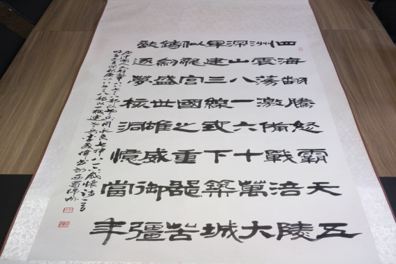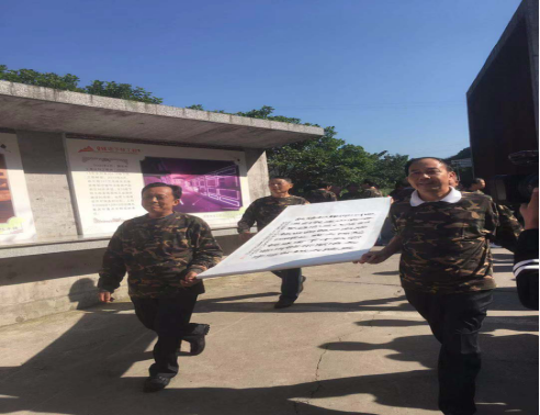 所有老兵集合列队!只听领队一声令下,老兵们迅速走回队伍依次列队。年长的老兵有75岁,年龄小的也有60多岁,虽然离开部队几十年,但军人本色、组织纪律依然犹在,工程兵开天辟地,卧藏深山修筑国防,履行使命职责的精神劲依然犹在。他们带着思念、带着回忆、带着初心、带着感激之情回到816。领队组织全体老兵列队合影,主持仪式向景区赠送老兵书写的字画。仪式上,四位老兵手扶字画两端,迈着整齐的步伐,庄重的将字画交给景区工作人员,以此感谢景区对816精神的继承和传播。