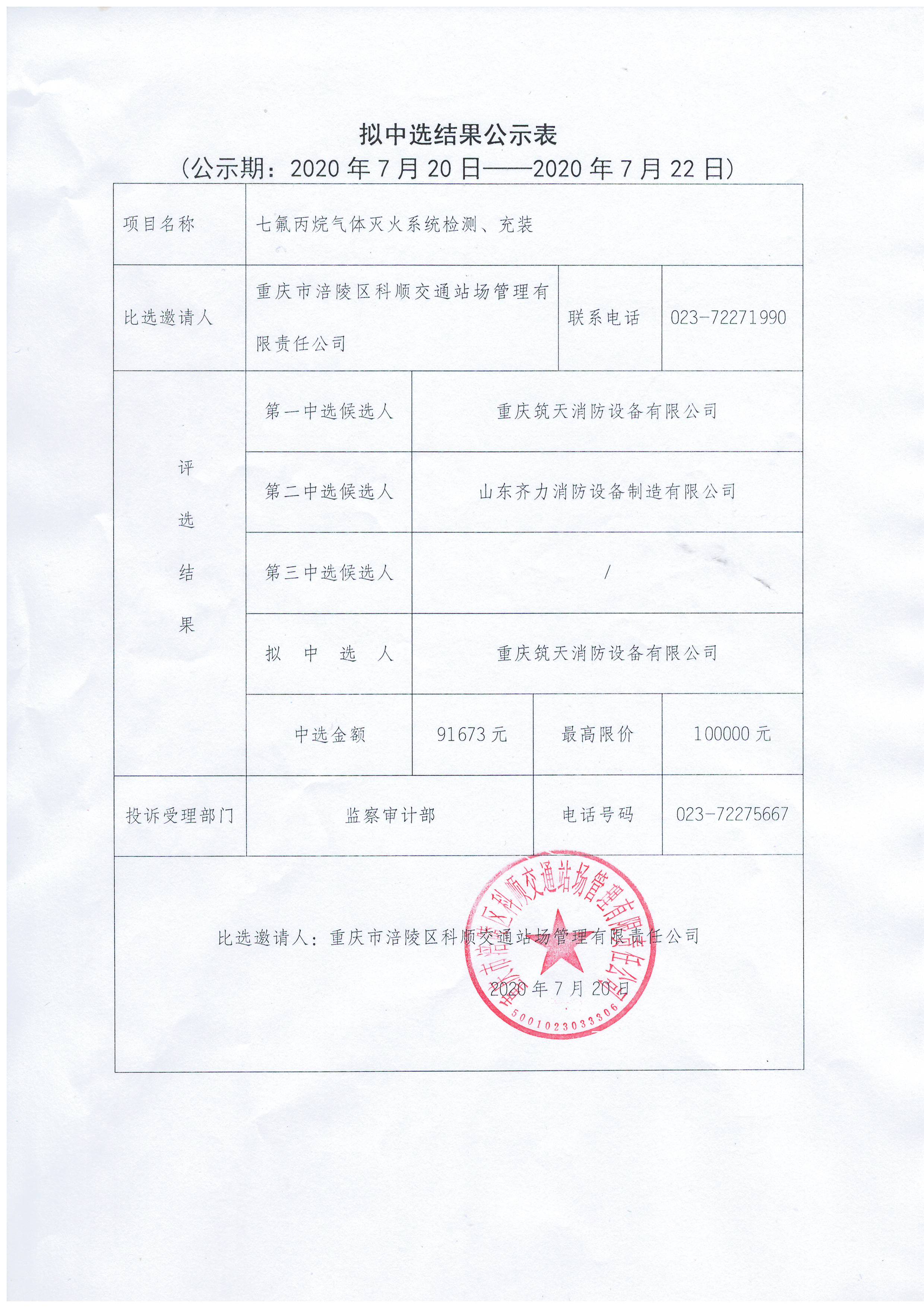 七氟丙烷气体灭火系统检测、充装拟中选结果公示